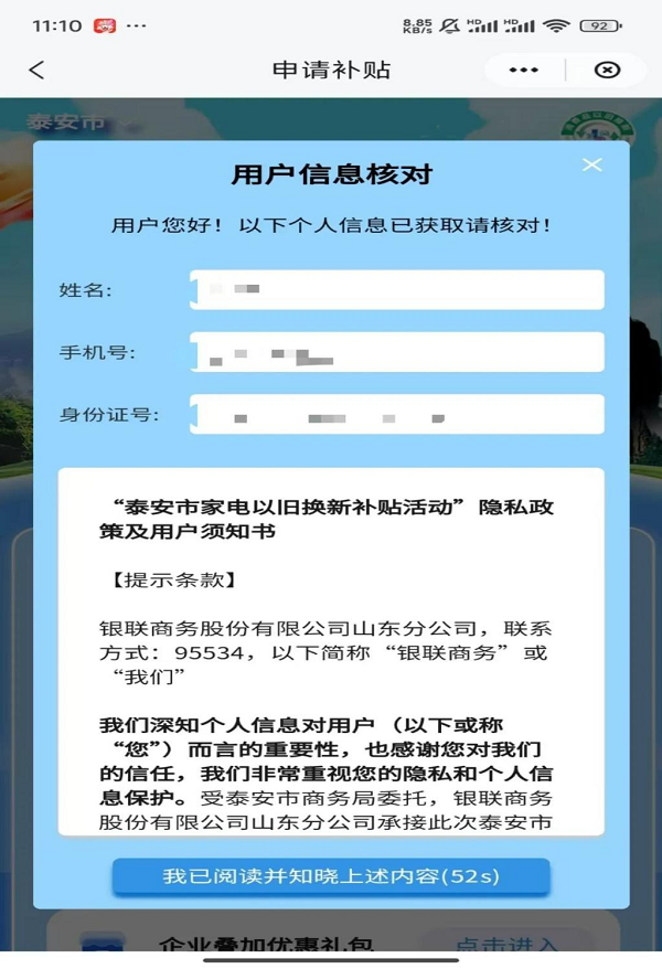 【申請補(bǔ)貼】用戶點擊進(jìn)入“家電補(bǔ)貼券申請”界面,系統(tǒng)彈窗提示授權(quán)申請,用戶同意云閃付 APP 授權(quán)“魯換新”小程序獲取注冊手機(jī)號、姓名、證件號信息,進(jìn)入“用戶信息核對”界面,信息核對無誤后,點擊“我已閱讀并知曉上述內(nèi)容”。