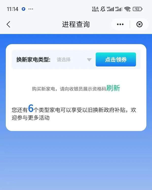 系統(tǒng)校驗用戶的以舊換新資格,校驗成功后,彈窗提示,用戶點擊確認(rèn),進(jìn)入領(lǐng)券界面,在“換新家電類型”的下拉框中選擇要領(lǐng)券的品類,點擊領(lǐng)券。頁面彈窗提示:“確認(rèn)要領(lǐng)取該類型的政府補(bǔ)貼券嗎?領(lǐng)取成功后將無法修改!”,點擊確定。領(lǐng)券成功,界面顯示以舊換新資格碼。
